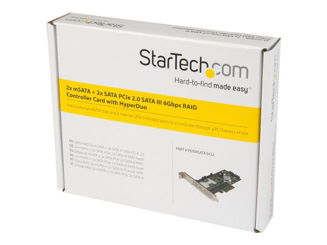 La carte SATA PCI Express PEXMSATA3422 vous permet d'améliorer la vitesse globale et la capacité de stockage de votre ordinateur en vous offrant plusieurs connexions SATA 6 Gb/s, qui permettent de brancher des disques SSD (lecteurs à état solide) haute performance et des disques durs à une matrice HyperDuo. Vous pouvez maintenant ajouter facilement deux slots mSATA et deux ports SATA III à votre ordinateur par le biais d'un seul slot PCI-E x4.