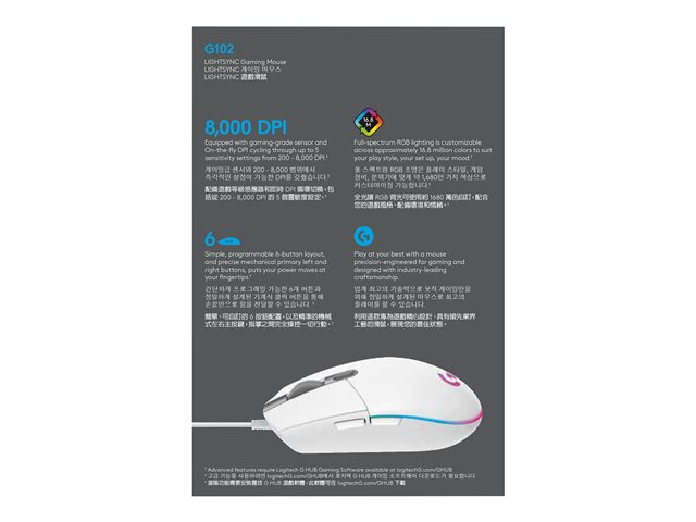 Description du produit Souris de jeu Logitech G102 LIGHTSYNC - souris - USB - blanc Type de périphérique Souris Technologie de connectivité Filaire - USB Couleur Blanc Orientation Pour droitiers Dimensions (LxPxH) 6.215 cm x 11.66 cm x 3.82 cm Poids 85 g Technologie de détection de mouvements Optique Nombre de boutons 6 Résolution 8000 dpi Performances Temps de réponse 1 ms, temps de réponse : 1 000 Hz, commutation de la sensibilité en temps réel 200 - 8000 ppp Jeu Oui Caractéristiques 6 boutons programmables, processeur ARM 32 bits, technologie LIGHTSYNC Longueur du câble 2.1 m Système d'exploitation requis Google Chrome OS, Microsoft Windows 7 ou ultérieur, Apple MacOS X 10.10 ou plus récent Garantie du fabricant Garantie de 2 ans -