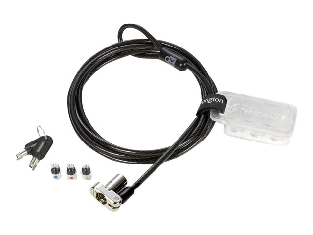 Description du produit Kensington Universel Serrure à clé pour ordinateur portable 3 en 1 - câble de sécurité Type de produit Câble de sécurité Matériau du produit Acier au carbone Longueur 1.8 m Caractéristiques Passe-partout, broche cachée, avec attache, pivotant, 5mm Keying System, réglage en rotation, Register & Retrieve Garantie du fabricant Garantie de 5 ans -